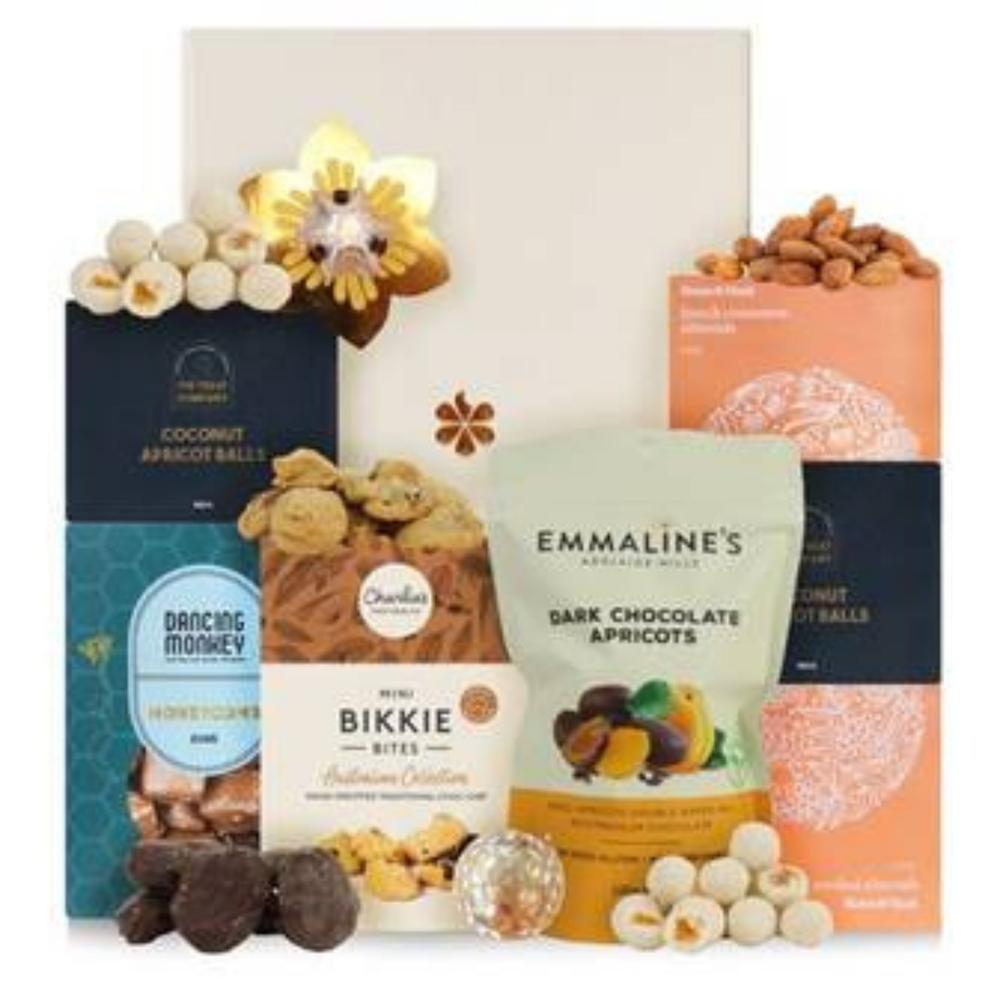- Signature Edible Blooms Hamper delivery box and packaging including a free gift card