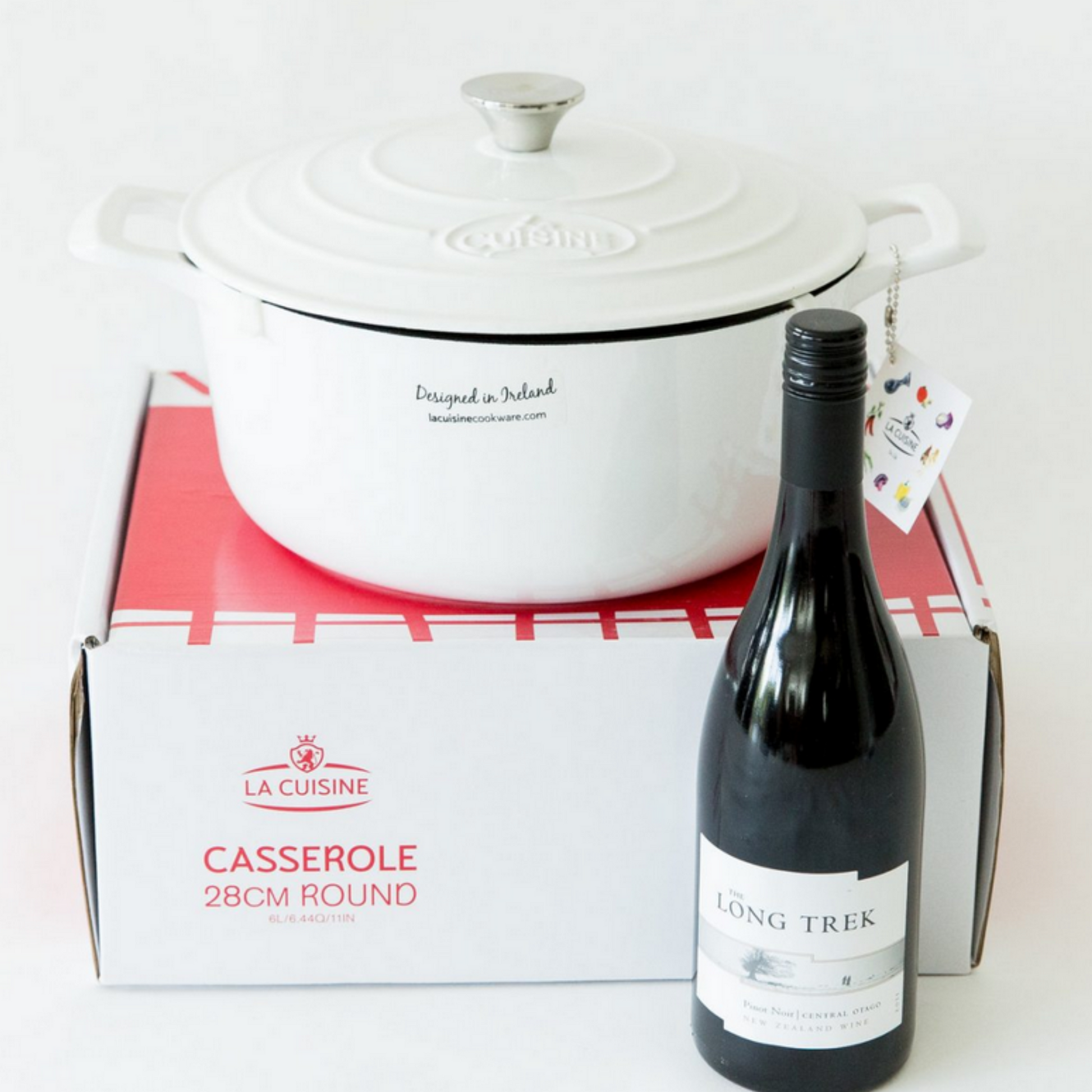 High quality premium enameled cast iron casserole teamed with NZ Pinot Noir or Sauvignon Blanc.