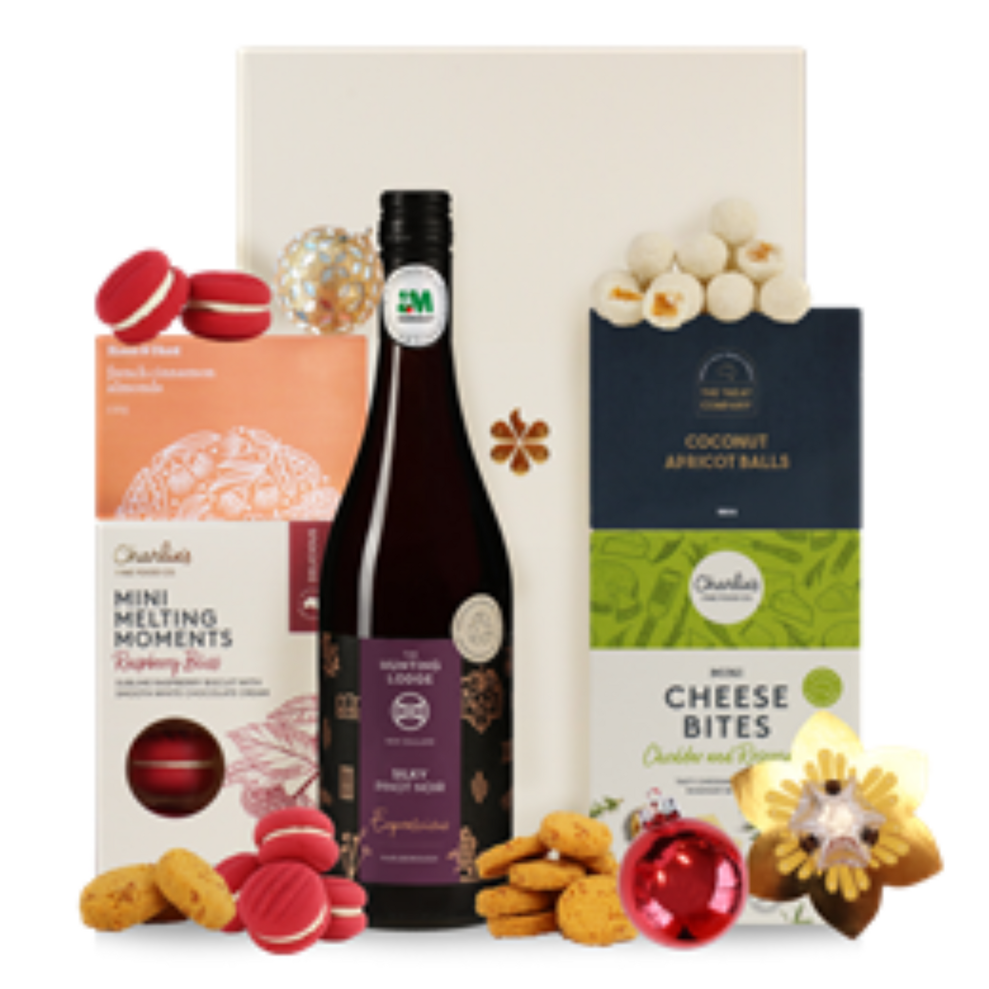 - Signature Edible Blooms Hamper delivery box and packaging including a free gift card