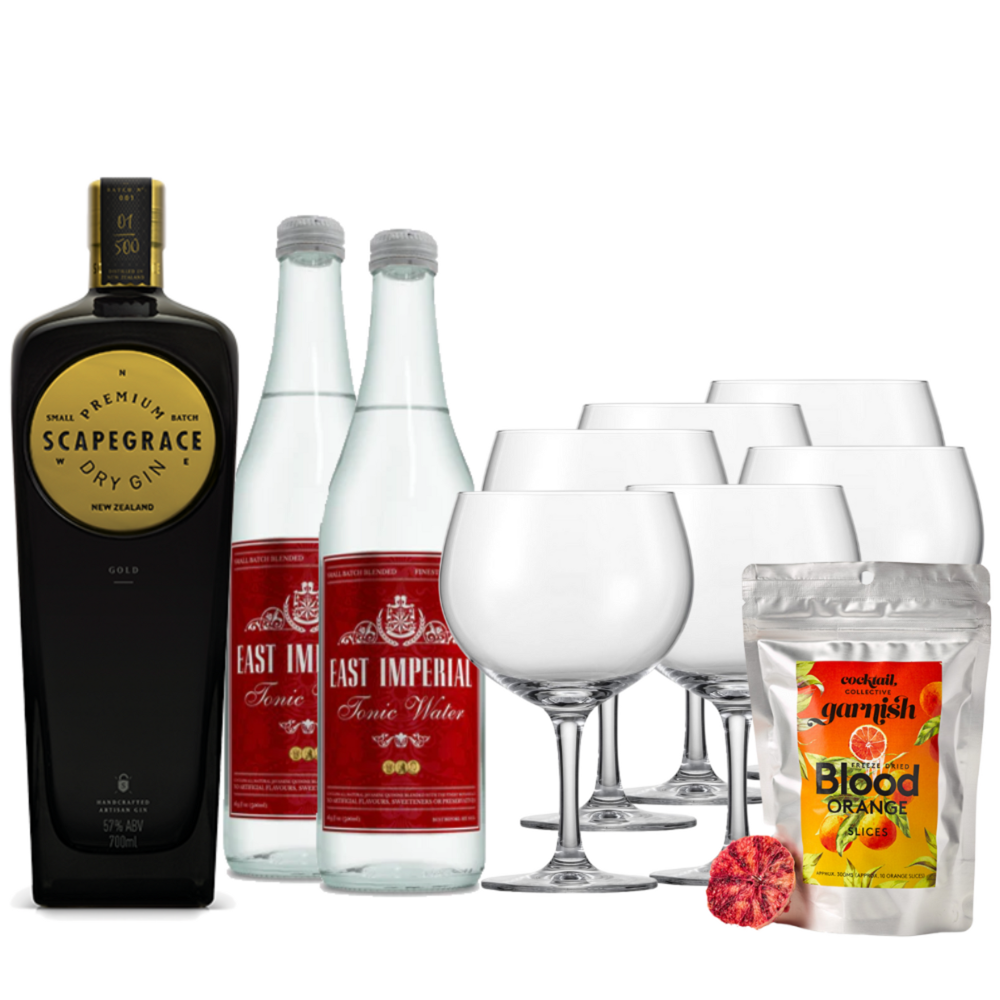 Scapegrace Gold Gin (700ml) + Set of 6 Schott Zwiesel Tritan Crystal G&T glasses + 2 x East Imperial Premium Tonic (500ml) + Blood Orange Cocktail Garnish
