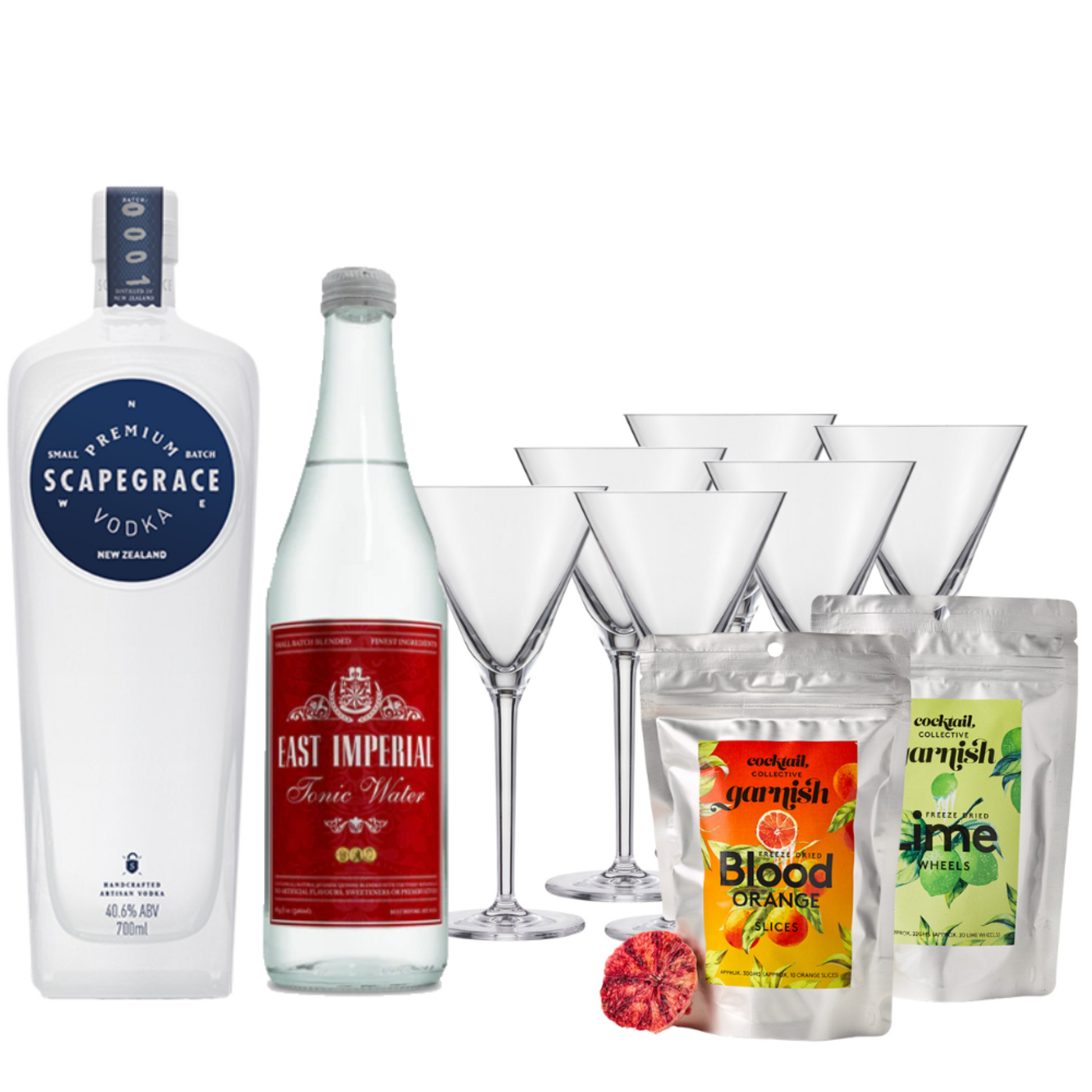 Scapegrace Premium Vodka & Tonic Set + Set of 6 Schott Zwiesel Tritan Crystal Vodka glasses + East Imperial Premium Tonic (500ml) + Blood Orange and Lime Wheel Cocktail Garnishes